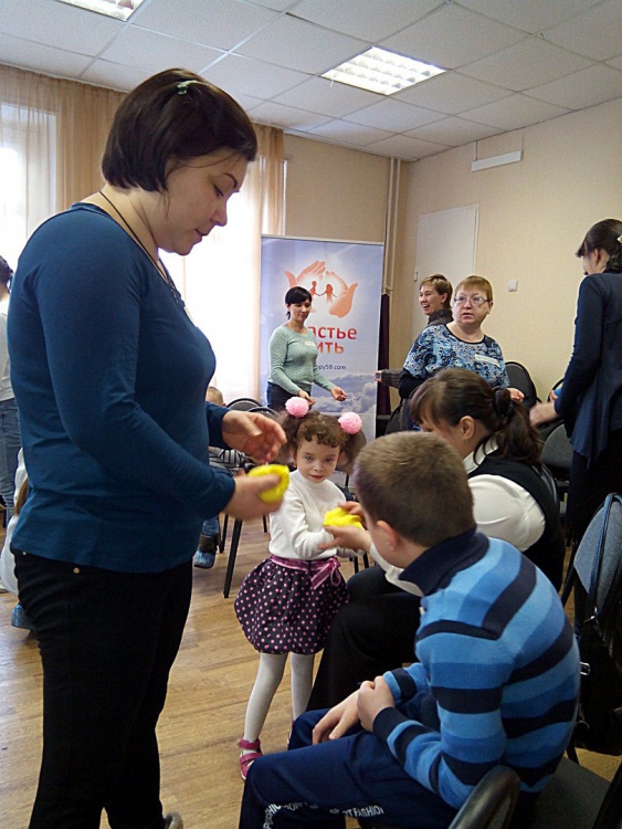 В игровой форме все участники учились слушать и отбивать ритм ладошками, палочками и мячиками. Пытались повторить гимнастику для мышц языка, которая помогает развивать артикуляцию.