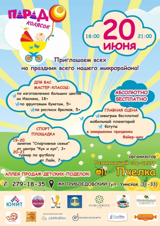 Развивающий Детский сад "ПЧЕЛКА" приглашает всех мам и пап города вместе с детьми и с нарядными колясками собраться в ЖК "Грибоедовский.