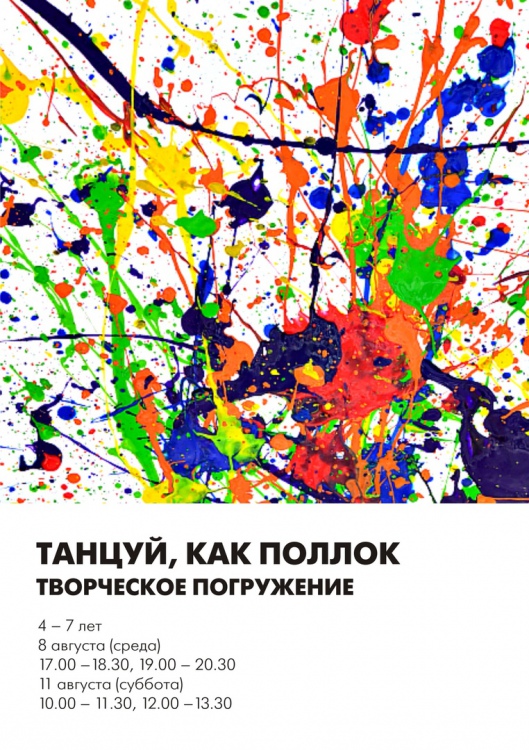 Знакомимся с творчеством Джексона Поллока, узнаем, что такое абстрактный экспрессионизм, танцуем и рисуем на огромных листах картона с помощью губок, больших кисточек, пульверизаторов, краски, муки и соли.