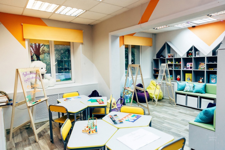Всё пространство создано так, чтобы ребенку и родителю было комфортно. Здесь множество игр, книг, мягких подушечек, пуфов и диванчиков. Зоны разделены на обучающую зону, где расставлены удобные для детей и родителей столы и стулья, и игровую с множеством интереснейших игр, пособий, конструкторов, а также специально созданных для детей мольбертов для рисования.