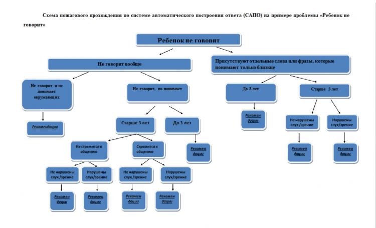 Иными словами, воспользовавшись Системой автоматизированного построения ответа (САПО), родитель увидит, что нужно учесть при взаимодействии с ребенком, к какому специалисту стоит обратиться, или на какие методики коррекции и реабилитации стоит обратить внимание.