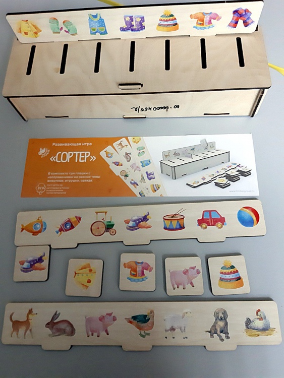 happiness.to.live@mail.ruРазвивающая игра "Сортер" состоит из закрытого контейнера с прорезями. В набор также входят три планшетки с изображением разных тем:игрушки,одежда и животные.