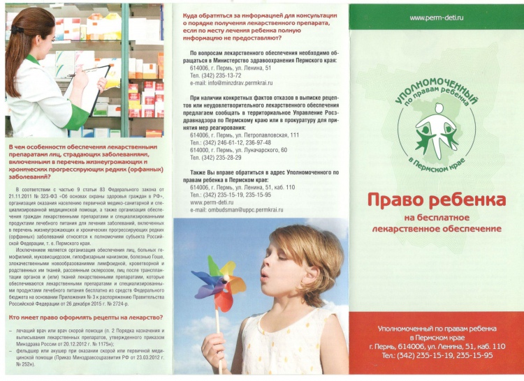 Получить листовку об основных государственных гарантиях в обеспечении лекарственными препаратами можно бесплатно в аппарате Уполномоченного по правам ребенка в Пермском крае по адресу: г. Пермь, ул.Ленина, 51 или на Стендах ПК ОО "Счастье жить", размещенным в ЦПМСС, ул.Комсомольский проспект, 84а, в КГБУ ЦРИ, ул.Сивкова, 14 и ПМПК, ул.Нефтяников.
