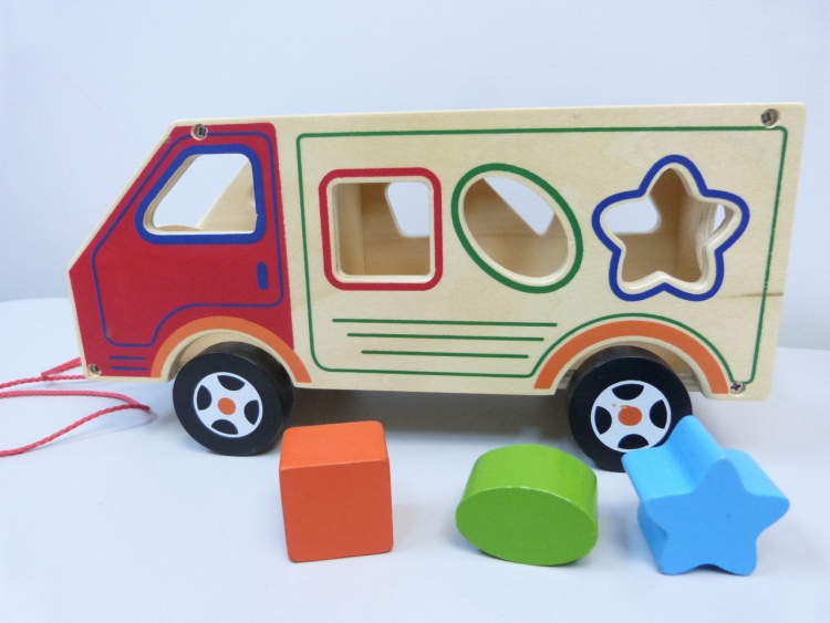 Пособие выполнено в виде машинки. Все стороны деревянного грузовика-сортера имеют прорези под фигуры. Отлично подойдет для развития моторных навыков и логического мышления, а также воображения.