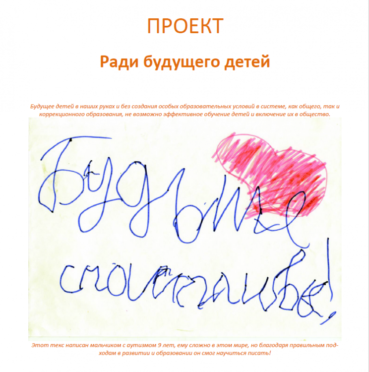 Второй Проект «Ради будущего детей», в рамках которого педагогам будет представлены не только основные знания по написанию адаптированных образовательных программ (АОП), но более того, даны практические навыки и помощь в адаптации дидактических пособий в интересах каждого отдельного ребенка и с учетом его особенностей и возможностей. Будут проведены проектные сессии для педагогов начальных классов. Еще важной уникальной составляющей проекта является открытие 3-х специальных коррекционных классов – ресурсной среды для детей, которые в настоящий момент вынуждены обучаться на дому или выведены на семейное образование не по медицинским показаниям, а в связи отсутствия создания специальных образовательных условий в рамках школы.